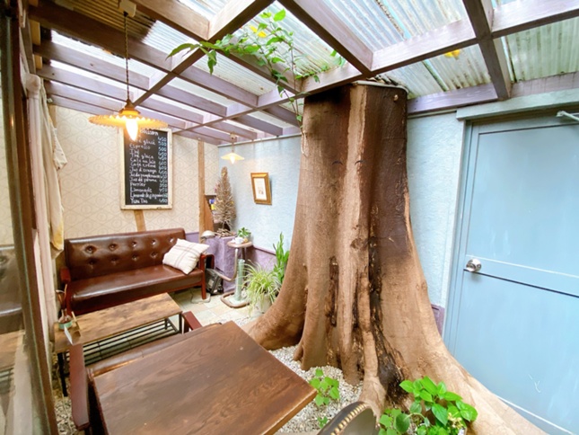 椋木の根っ子がそのまま空間に組み込まれていて、